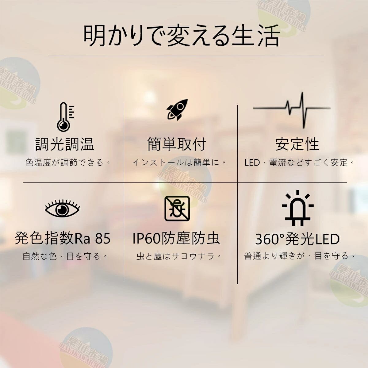 高品質のLEDチップで長寿命&電気代も節約 高品質なLEDチップを採用し、ライトが点灯しているとき、点滅せず均一な照明の効果を達成します。LEDチップだから長寿命、約40000時間!消費電力は白熱灯より約半分!お部屋全体を美しく照らす同時に、電気代も抑えられます!一度設定して、約10年交換不要。
