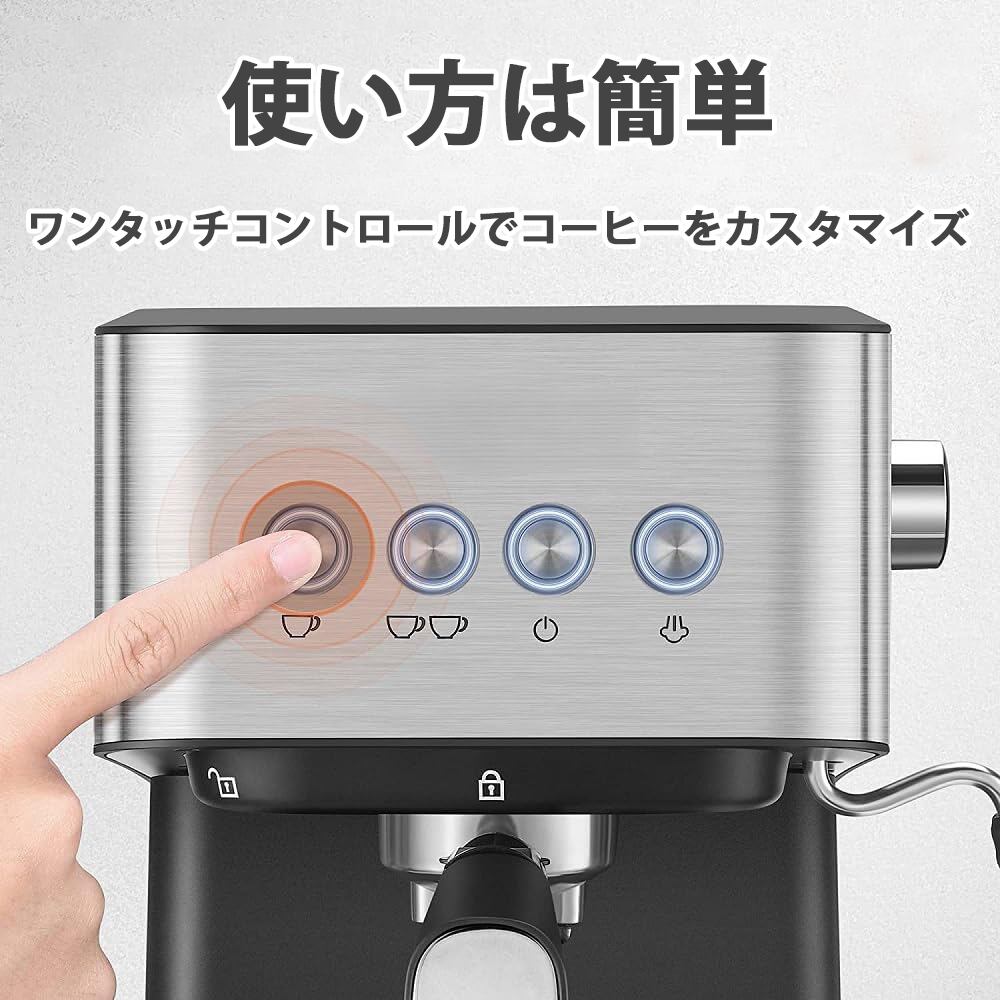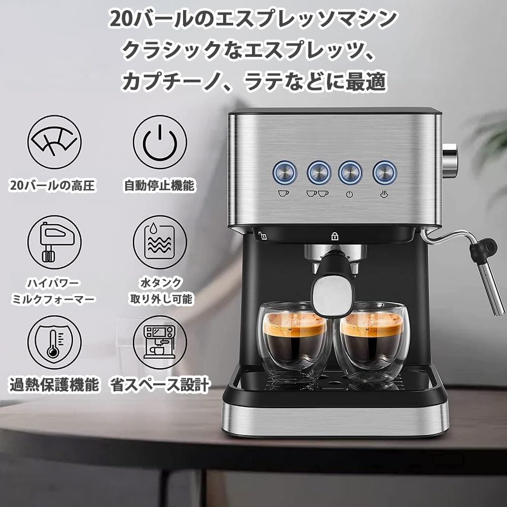 コーヒーマシン バーエスプレッソマシンオールインワン半自動コーヒーマシン、ミルク泡立て器スチームワンド/コーヒーポルタフィルター/ポルタフィルターバスケット/カプチーノ小型半自動コーヒーメーカー 大容量 家庭用半自動小型