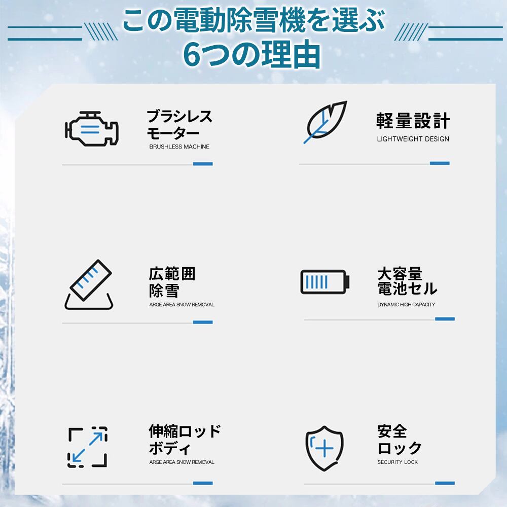 電動除雪機には3.0 Ahの大容量バッテリーが搭載されています。高性能バッテリーにより、長時間の作業が可能で、一回の充電で最大20-25分間稼働します。これにより、柔軟性が向上し、頻繁な充電が不要になり、ユーザーにとってより便利です。