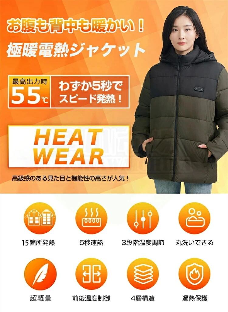 電熱ジャケット フード付き 長袖 15エリア発熱 インナーパーカー アウター 上着 電熱 ベスト usb メンズ レディース 電熱ウェア ブルゾン 防寒服 作業服 電熱服 USB充電 ポカポカ 防寒対策 通勤通学 釣り 保温 速暖 水洗いOK バイク パネル 冷え対策 冬 アウトドア PSE認証済