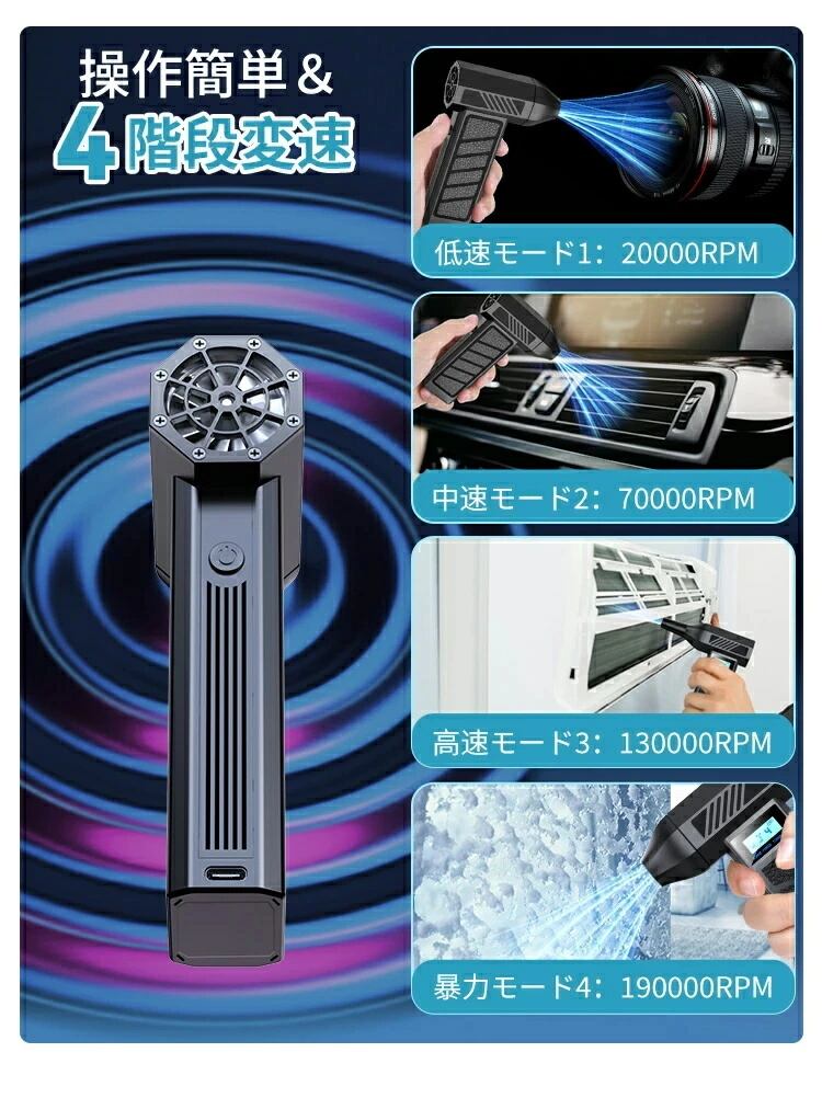 【2025年新発売四段階風速調整】電動 エアダスター 小型 爆風 73m/s 130000RPM強力風速 USB充電式 8000mAh大容量 コンパクト ブラシレスモーター LED照明 SOSライト付き エアー缶 代替品 ブロワー 洗車 PCキーボード掃除