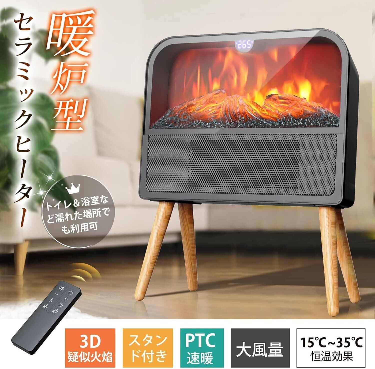 防湿スタンド付き&トイレ/浴室対応】革新的な木質スタンドとのデザイン、優れた耐久性木材と環境に優しい防水塗料を採用され、よく濡れた地面でも本製品のセラミックヒーターを置いて利用できるし、転倒保護安全装置付き、リビングだけでなくトイレ、浴室、洗面所、キッチンなど場所でトイレヒーター、浴室ヒーターとしても大活躍。