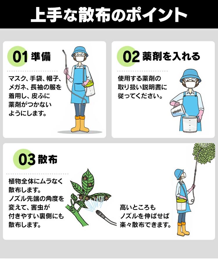 12L大容量タンクの全自動噴霧器として、手動式・蓄圧式に比べ、ボタンを押すだけで作業ができ、2500MAリチウムバッテリー付きで、長時間作業を支えます。これによって、負担軽減や時間短縮が実現し、大量や大面積の作業を素早く簡単に済めます。