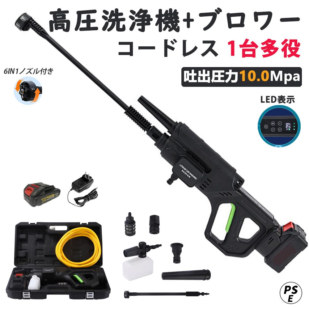 高圧洗浄機 コードレス ブロワー 充電式 ブラシレスモー 2In1 6段階マルチスプレー 10MPa吐出圧力 強力噴射 高圧クリーナー ハンディ 21V バッテリー 自吸式 家庭用 ベランダ 収納ケース付 ベランダ PSE認証