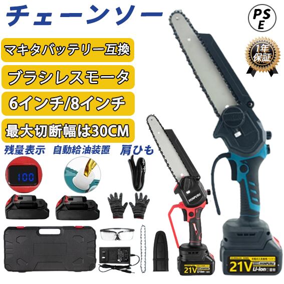 チェーンソー 充電式チェーンソー ブラシレスモー ハンディ チェーンソー 有効切断長300mmミニチェーンソー 電動のこぎり 工具レスチェーン調整 自動給油 LEDバッテリー残量表示 充電式 ポータブル 竹切り 枝を切る 木を切るに適用する