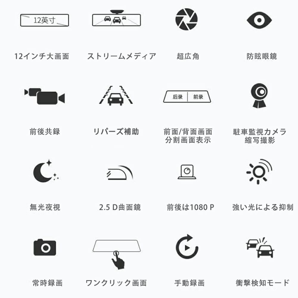 ドライブレコーダー ミラー 前後 大画面 12インチ 4K SONY製IMX589センサー タッチパネル フルHD 高画質 GPS搭載 WIFI 170°広角 常時録画 駐車監視 ノイズ対策 WDR 暗視 防水 日本車仕様 右ハンドル