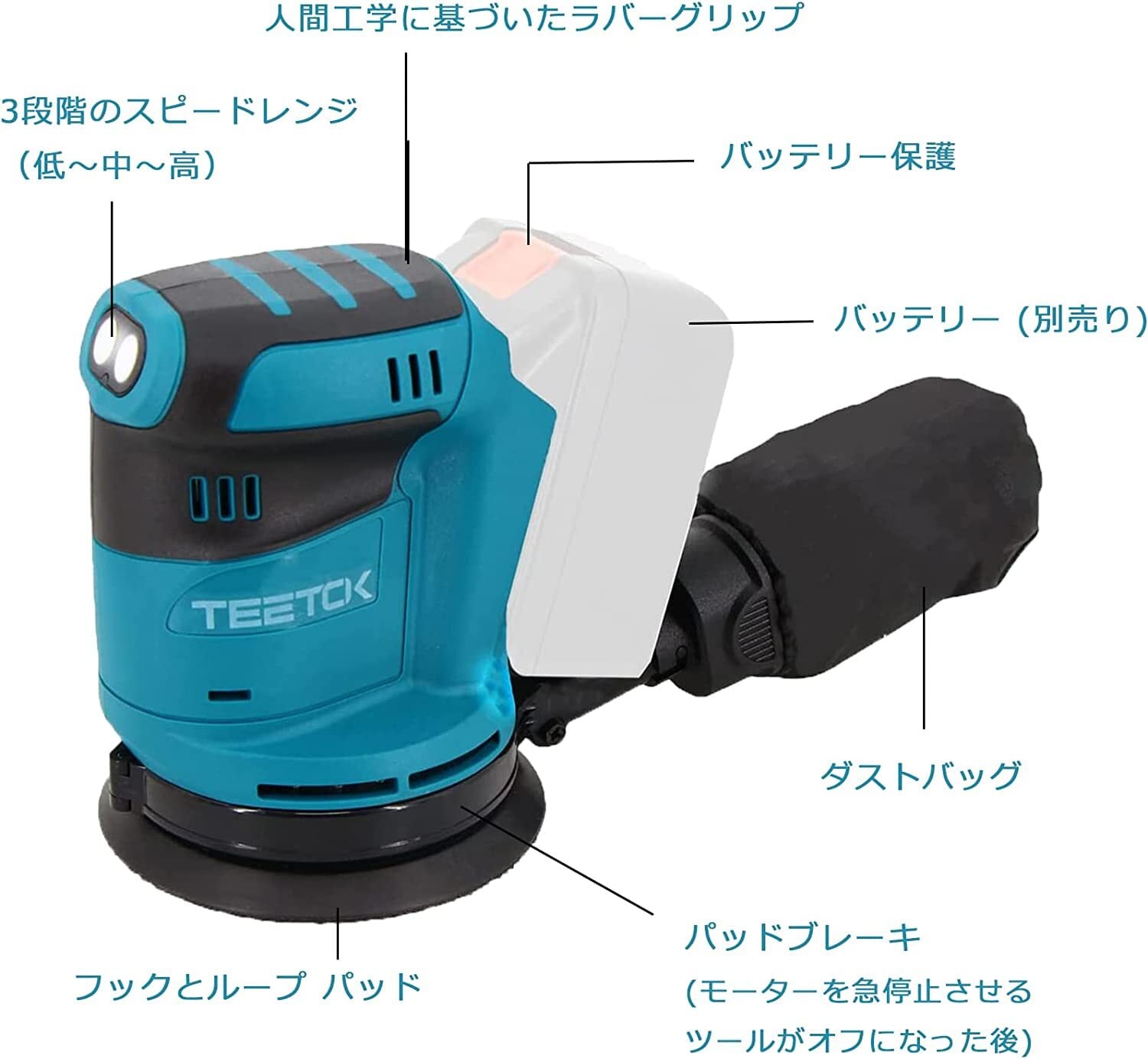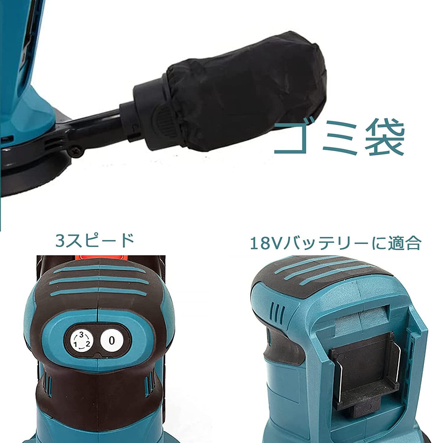 充電式 ランダムサンダー 電動サンダー ペーパー寸法 125mm マキタ 18Vバッテリーを対応 電動サンダー コードレス 集じん機能内蔵 3段階変速 最大11000RPM 集じんシステム付き 表面研磨 DIY 木材仕上がり 作業工具 マジック式