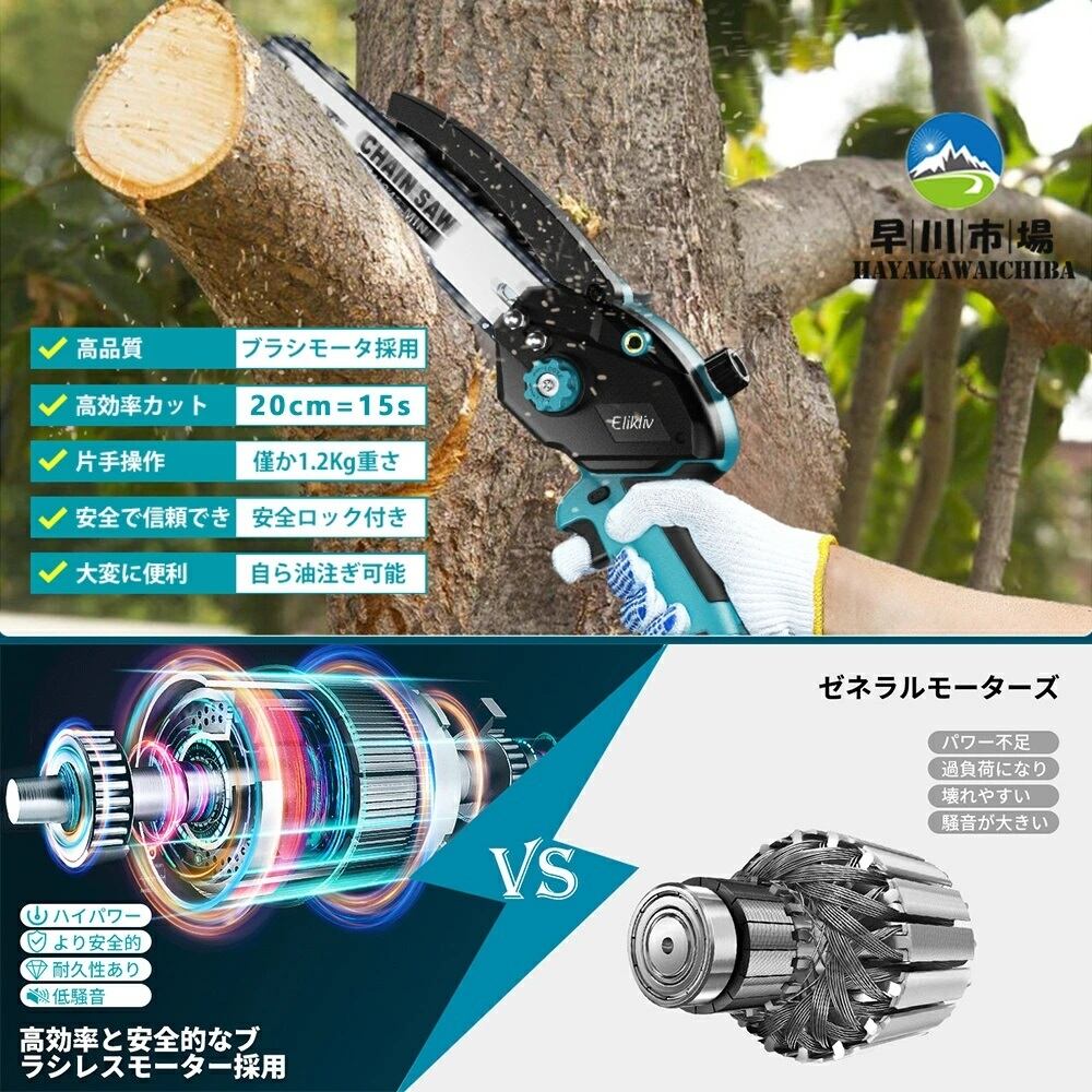 【2個バッテリー付き 収納箱付き】チェーンソー 充電式 8インチ 電動チェーンソー コードレス ブラシモーター採用 給油可能 電動のこぎり 切段物径200mm 強力 軽量 女性/初心者も対応 高枝切りチェーンソー 片手 枝打ち 草刈り 薪作り 農業