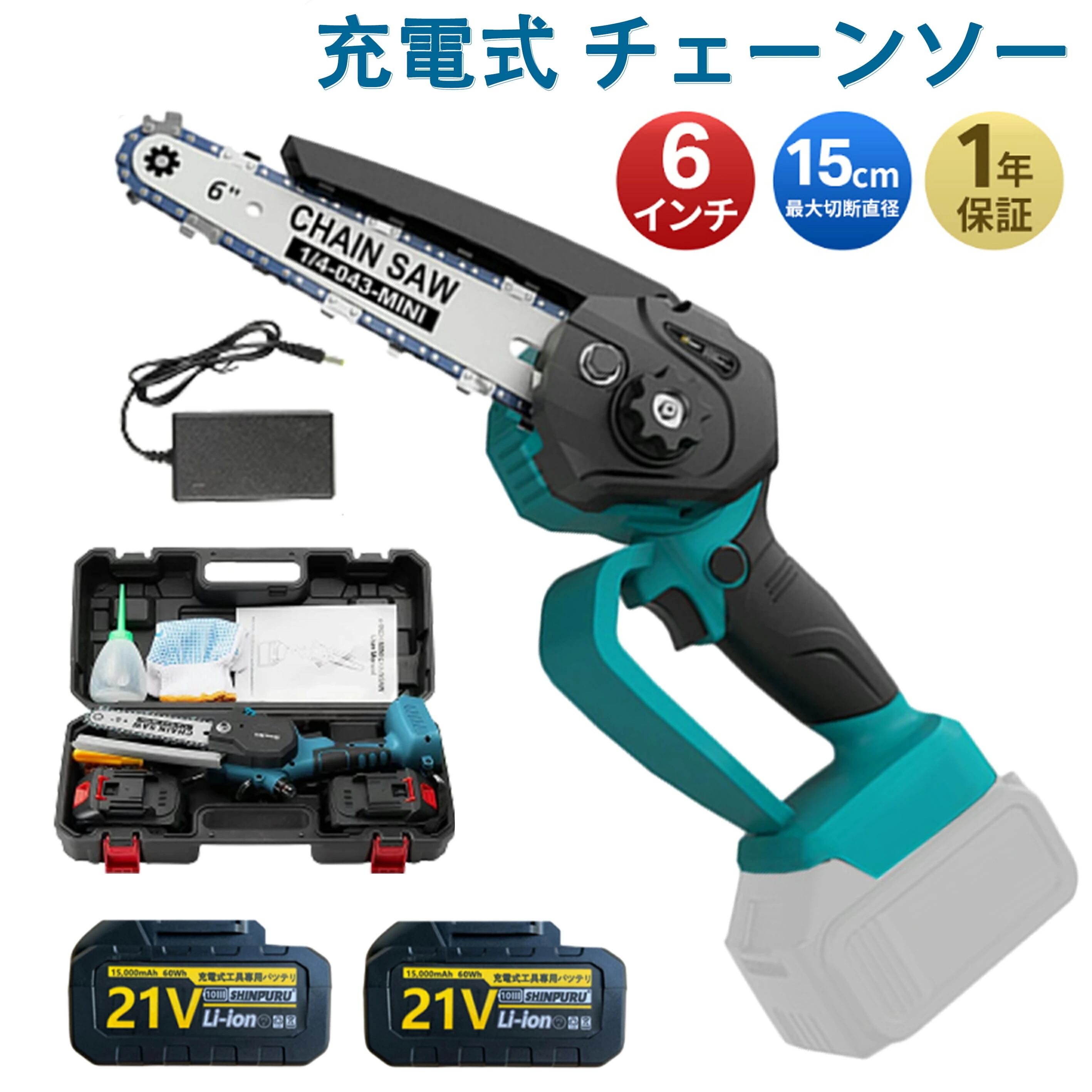 チェーンソー 充電式 電動チェーンソー 6インチ 家庭用 小型 コードレス 充電式 ハンディチェーンソー 電動のこぎり 電動ノコギリ 21Vバッテリー 切断直径15cm 家庭用 片手 軽量 庭木剪定 木工切断 PSE認証取得切断直径150mm
