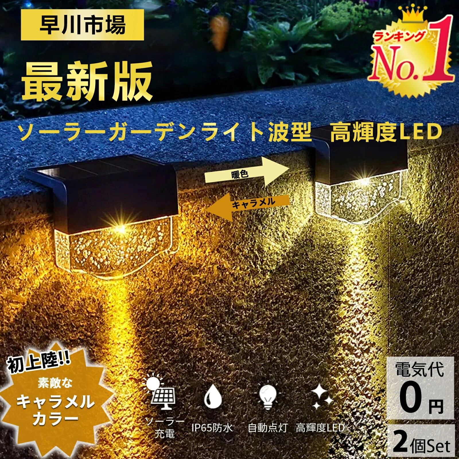 ソーラーライト 2個セット 波形 バブル フェンスライト 照明器具 ガーデンライト 階段 ガーデン ライト 暖色 キャラメル色 明暗センサー 屋外 自動点灯 デッキライト 防水 LED ソーラーランプ 門灯