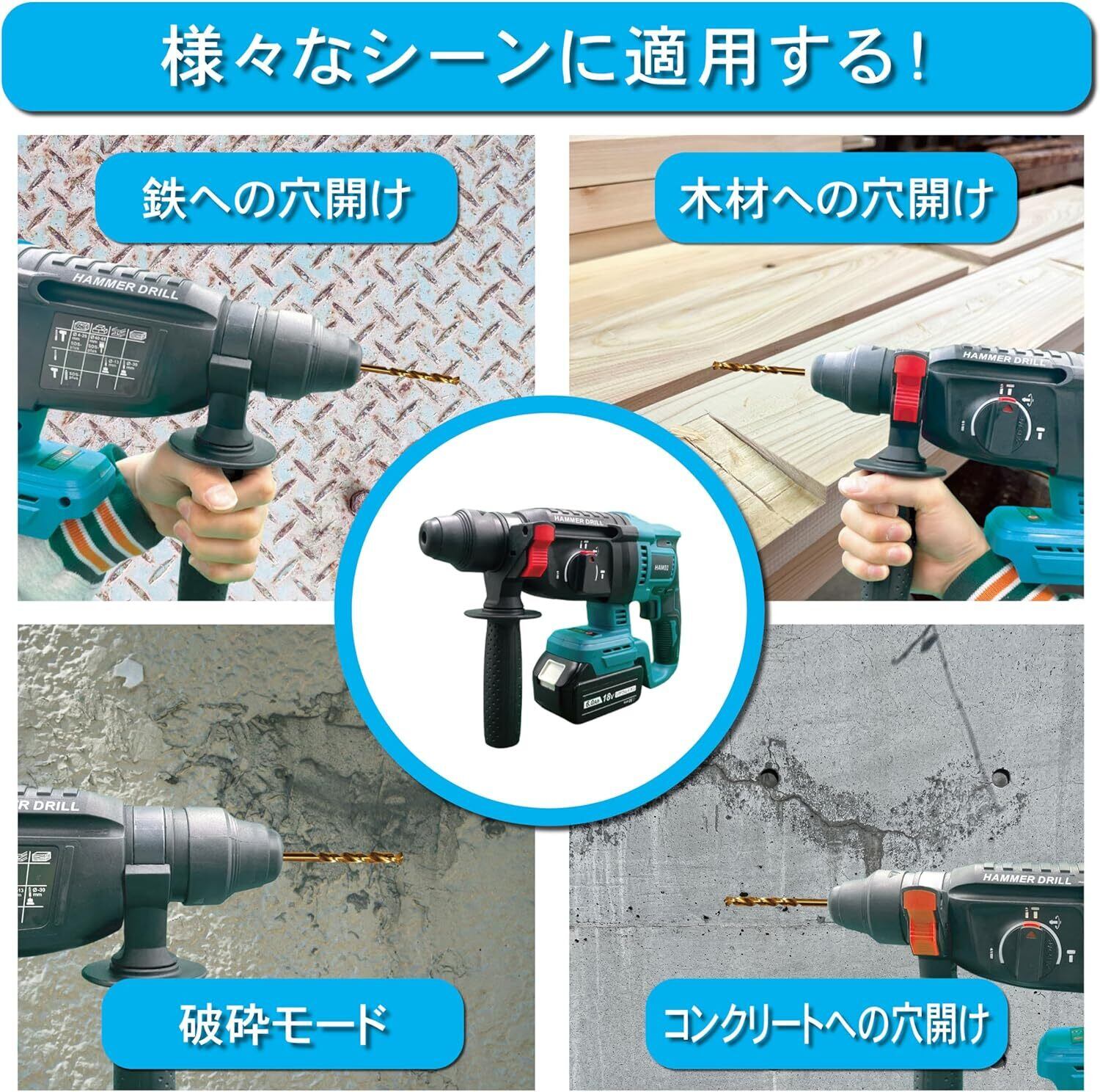 ハンマドリル 充電式 電動ハンマー コードレスハンマードリル ブラシレスモーター 電気ハンマードリル 無段変速 3つモード 電動ハンマ ハンマドリル 家庭用
